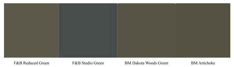 Take a look at a recent project where we tested a range of deep greens; Farrow & Ball’s Reduced Green & Studio Green (trim color as well), and Benjamin Moore’s Dakota Woods Green & Artichoke, directly on the home's exterior.